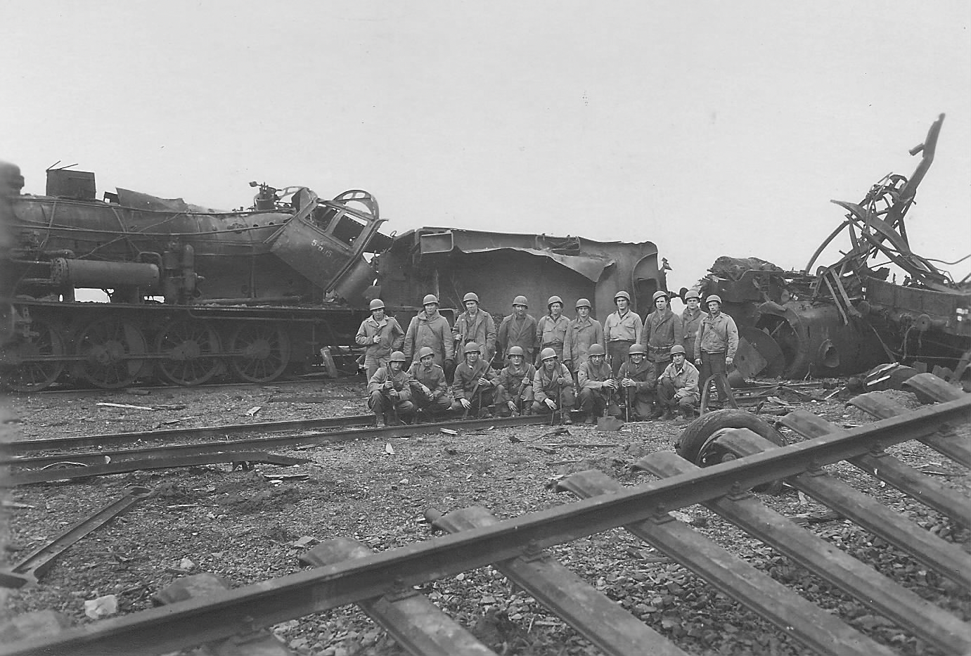 U.S. Army soldiers of the 732nd Railway Operations Battalion in front of a destroyed steam engine at Perl Zollbahnhof (Perl customs railyard), Germany