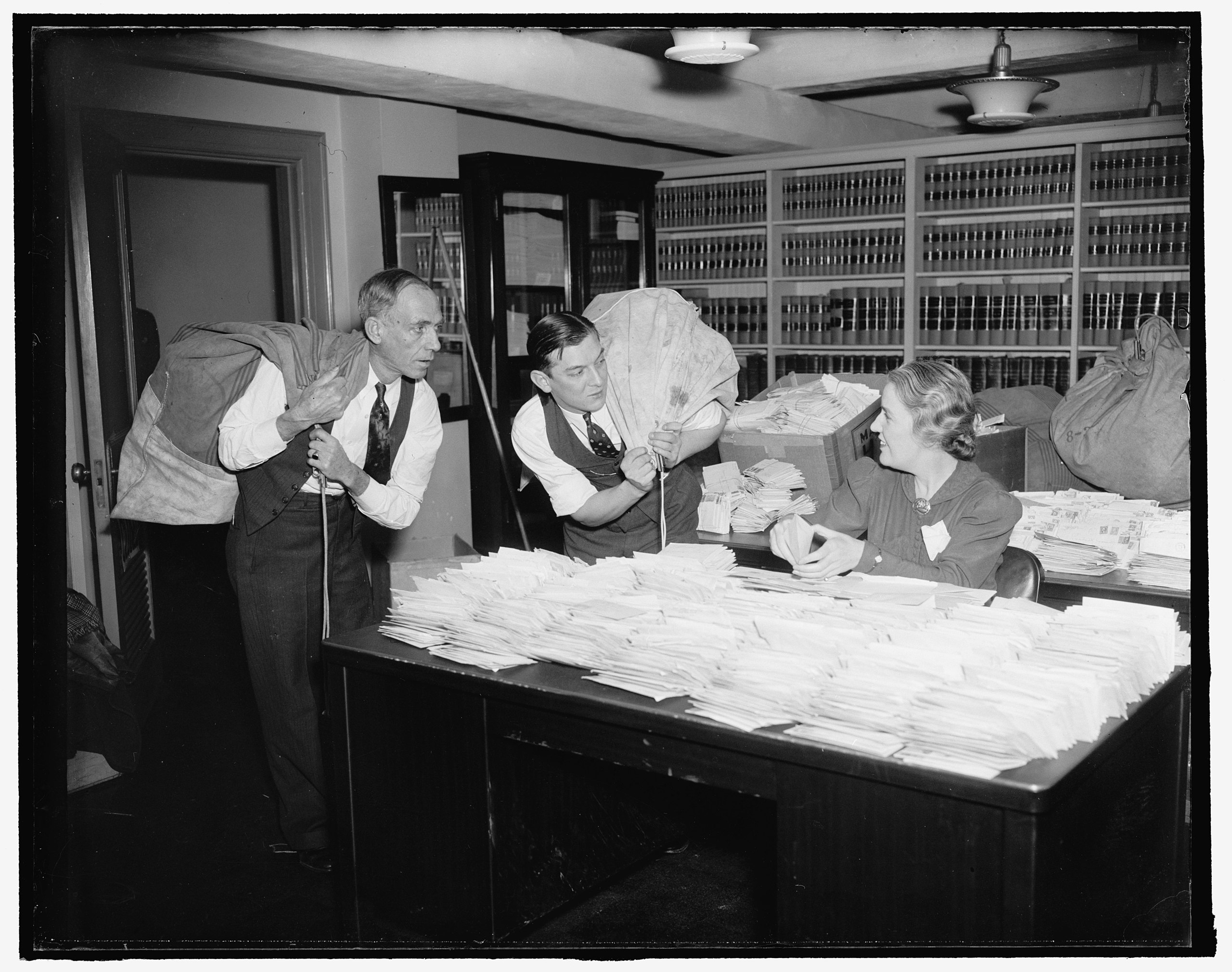 Huge task for Presidential Secretary. Washington, D.C., Jan. 28. The White House was virtually swamped today with letters containing 10-cent contributions to National Foundation for Infantile Paralysis. Miss Margaret Lehand, Personal Secretary to President Roosevelt, is shown as she began opening the first batch of 30,000 to arrive. By noontime an extrea crew of mail clerks had to be put on the job.