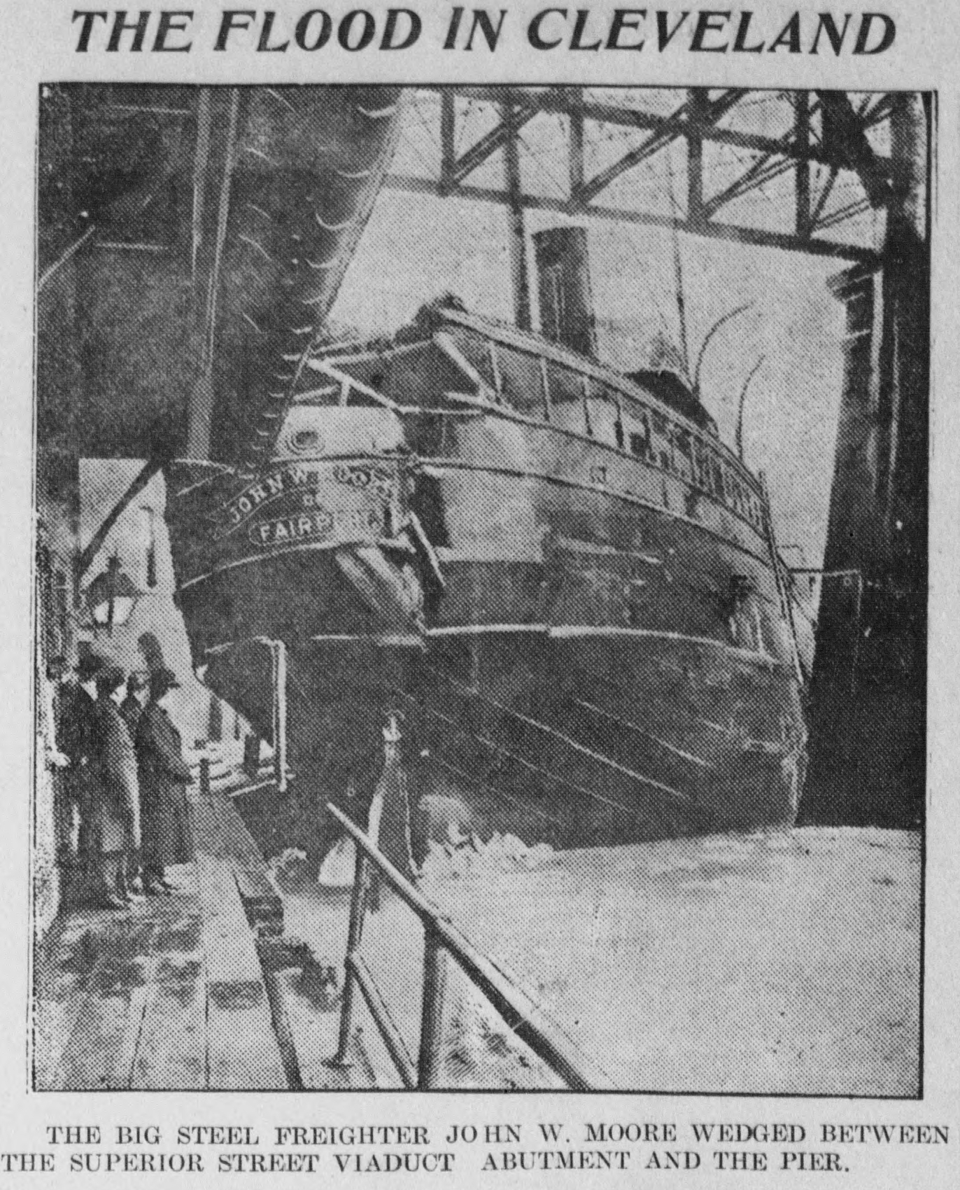 The freighter John W. Moore that was wedged between the viaduct on Superior Street and the pier in Cleveland.