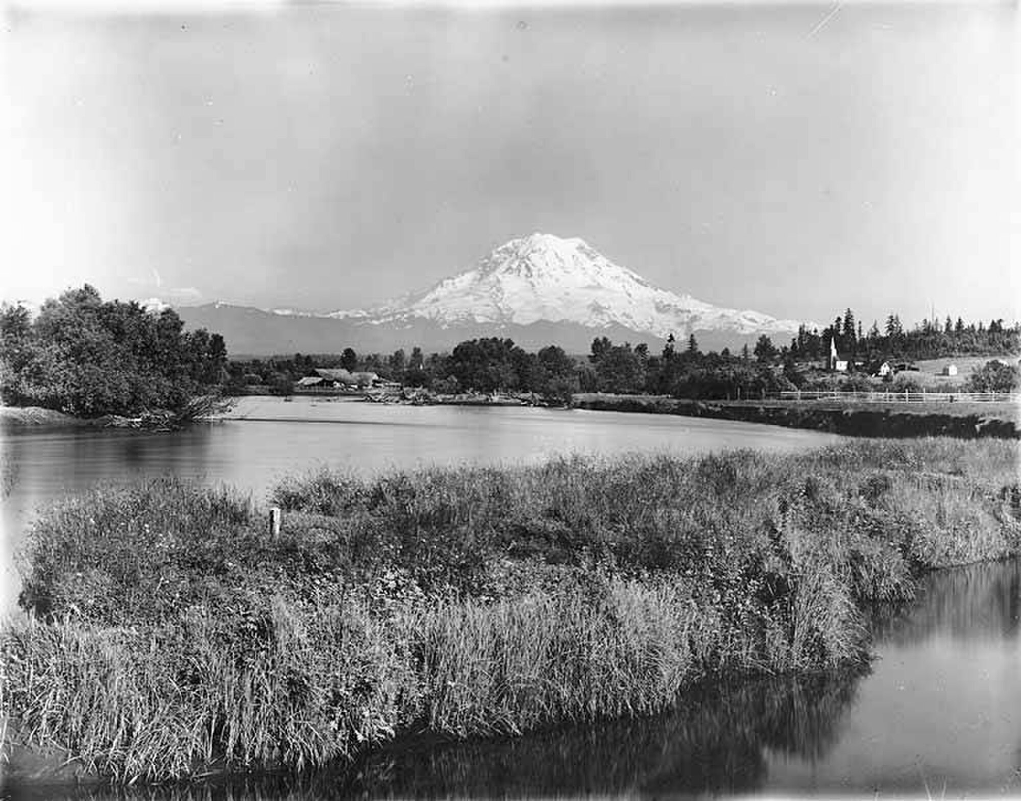 View of Mount Rainier looking southeast up Puyallup River, Tacoma, July 1, 1899