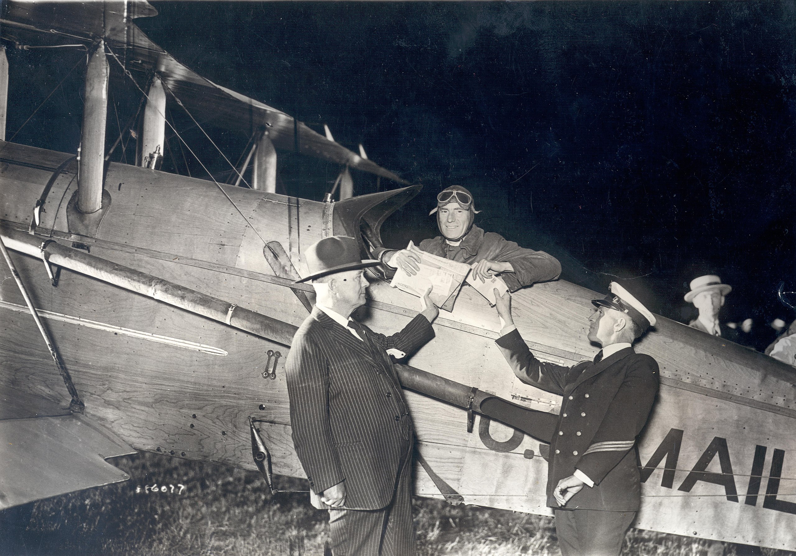 On July 1, 1925, James DeWitt Hill, a pioneering airmail pilot, is presented with a ceremonial sack of mail at Hadley Field in New Jersey. With this occasion, the United States’ first regularly scheduled transcontinental night-and-day airmail service was inaugurated. Shortly before nine o’clock at night, hundreds of cars lined the field, their headlights blazing, creating a makeshift runway glow that led Hill into the night sky as he got ready to take off.