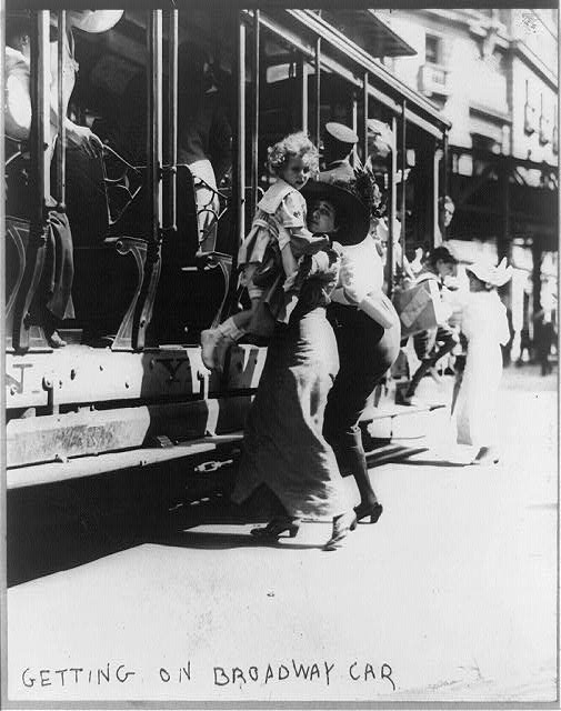 Getting on a Broadway streetcar in New York City