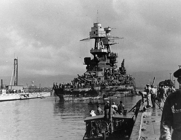 Here she is being refloated in 1942 after being severely damaged during the attack on Pearl Harbor. After repairs, she was put back into service and was used throughout the duration of WWII.