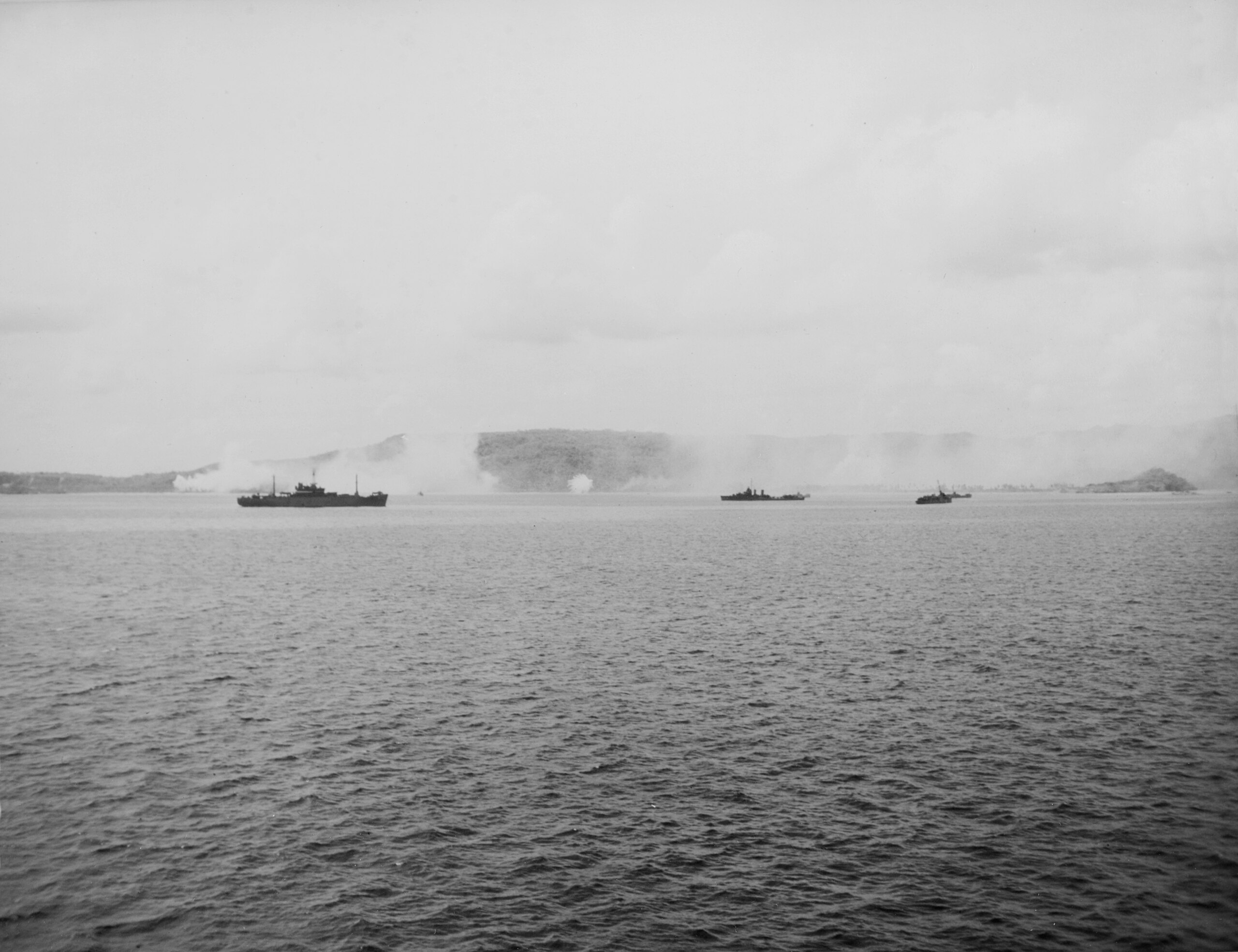 Seen from the deck of the USS New Mexico on July 14, 1944, the pre-invasion bombardment of Guam thundered across the horizon as American forces shelled their own territory—occupied by Japan since December 1941. Once a quiet U.S. possession, Guam had been transformed into a fortified enemy stronghold. The shelling, part of Operation Forager, aimed to dismantle Japanese defenses ahead of the amphibious landings. With battleships roaring, underwater demolition teams clearing coral obstacles, and landing craft circling like sentinels, the photo captures the paradox of war: reclaiming home through fire.