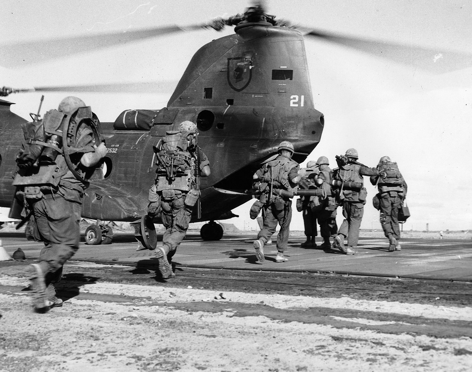 In the heat of Operation Buffalo, Marines of the Third Battalion, Ninth Regiment board CH-46 helicopters at Dong Ha—racing to reinforce the First Battalion, Ninth Regiment near Con Thien, where an ambush turned the battlefield into a crucible of fire and resolve.