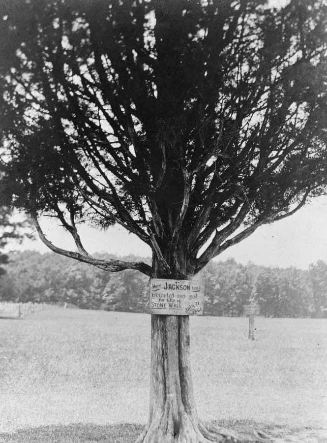 Plaque attached to a tree that says “Here Jackson was wounded and got the title of Stone Wall, July 21, 1861”
