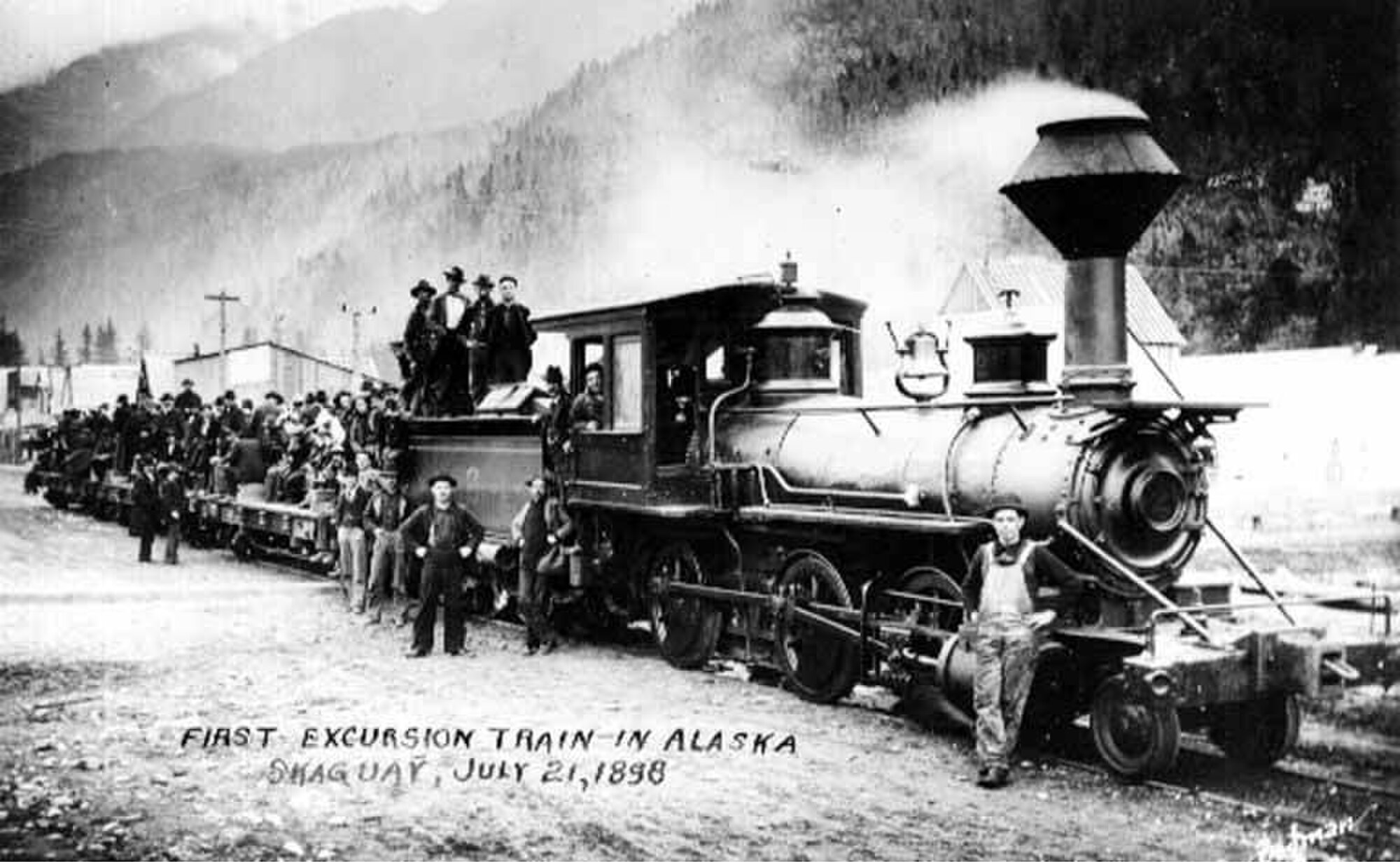 Passengers on the first excursion train in Alaska, Skagway, July 21, 1898.