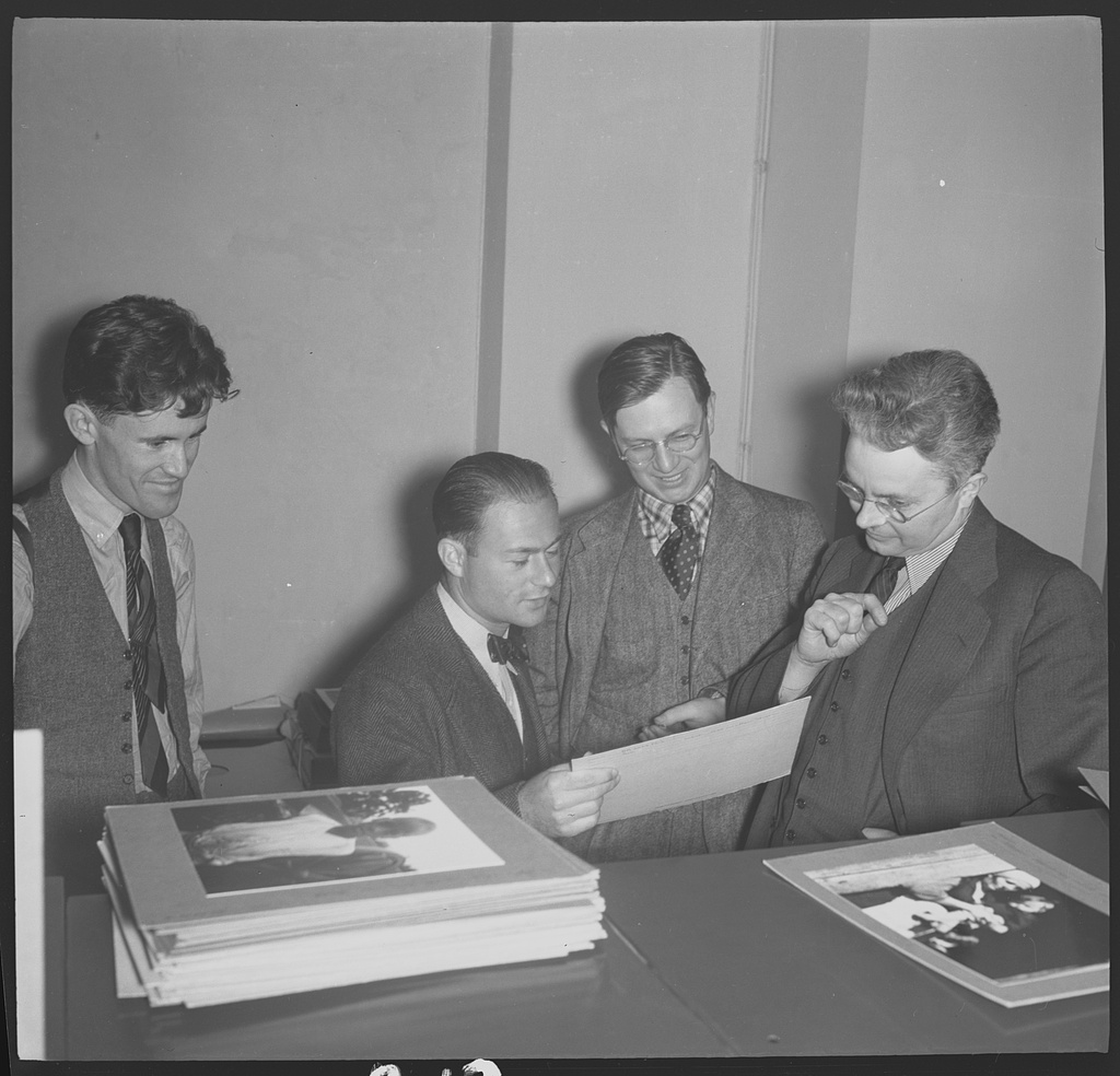 Here is Russell Lee (second in from the right, standing between the two others) reviewing photos with other FSA photographers via Library of Congress, no known restrictions