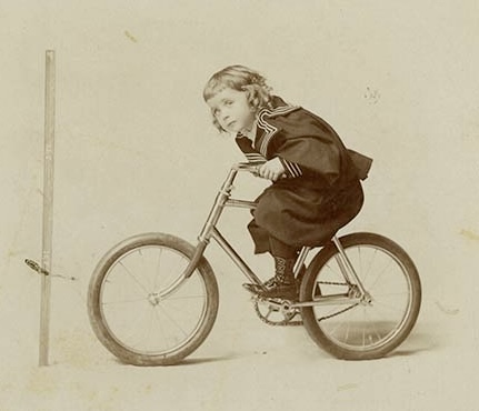 Caption reads “Miss Valentine Conwell, age 3 years and 4 months, the youngest cyclist in the world.”