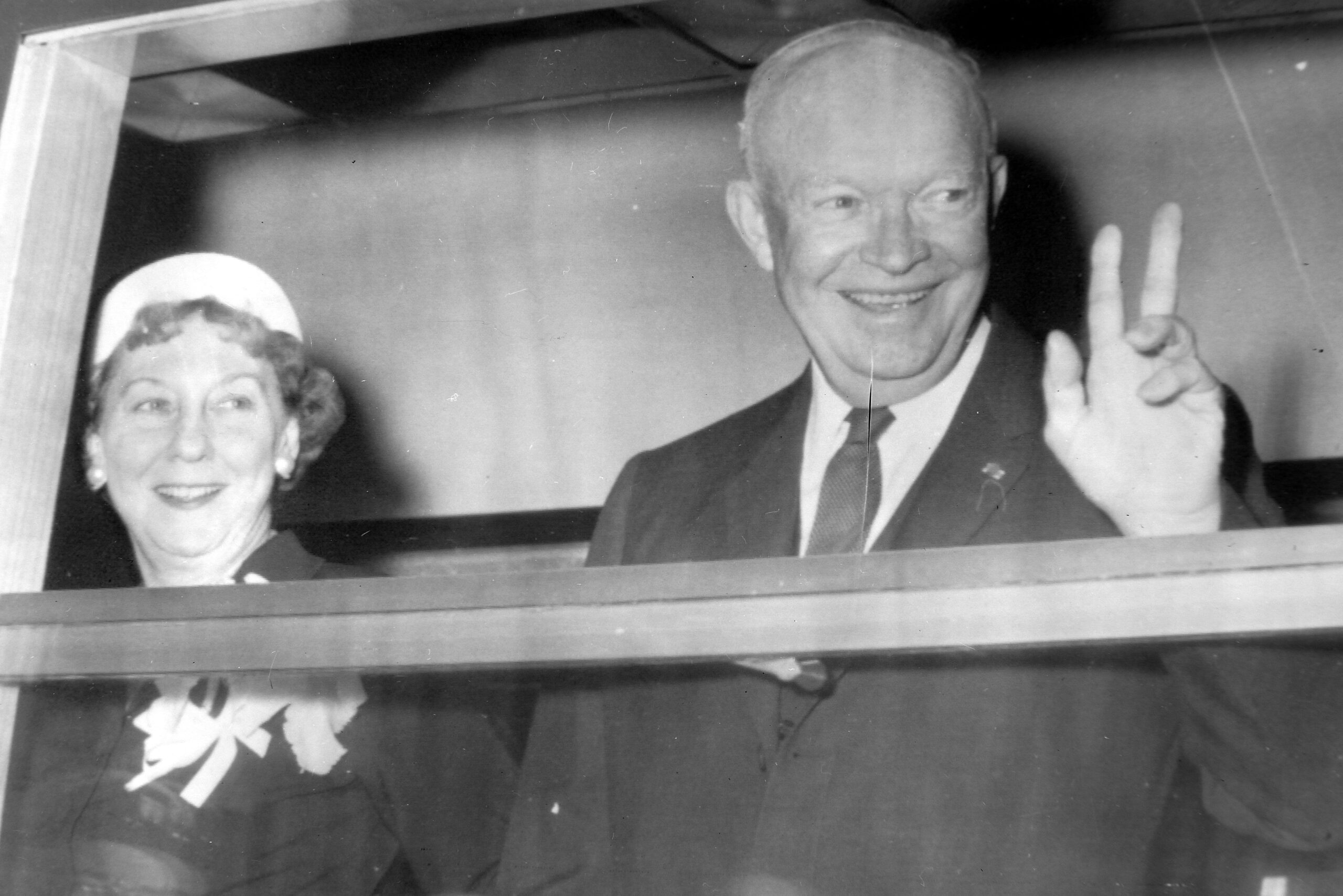 July 23, 1962 — Standing aboard a Paris train with Mamie at his side, Dwight D. Eisenhower waves to the crowd. Their European holiday included a visit to the Normandy battlefield, where Eisenhower had once commanded Allied forces. Joined by grandchildren and traveling in special rail cars from Cherbourg, the former president called it a grandfather’s holiday. Yet as the train rolled into Paris, cheers of ‘Vive Ike’ reminded him—and the world—that history was never far behind.