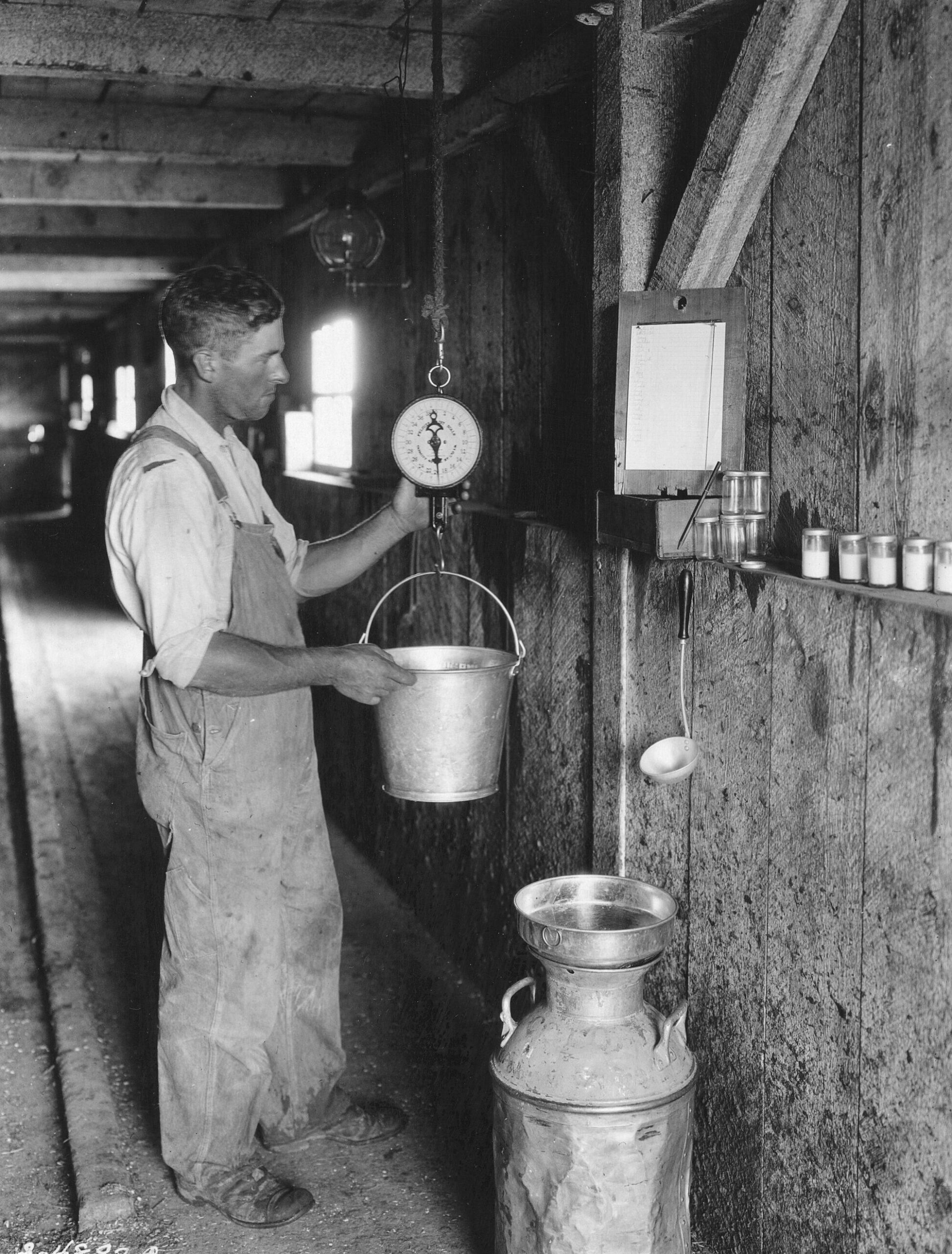 Roy Vanderwall weighing milk on his farm in the Muddy Creek community in Baker County, Oregon, July 23, 1925