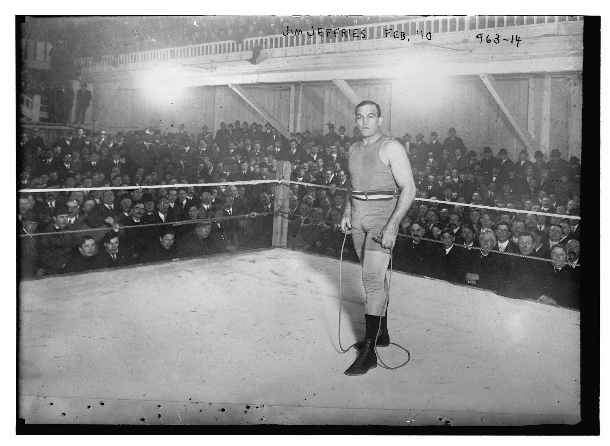 In this 1910 photograph, the stakes have shifted. Surrounded by spectators, rope in hand, Jeffries prepares for his fateful comeback against Jack Johnson—the Fight of the Century