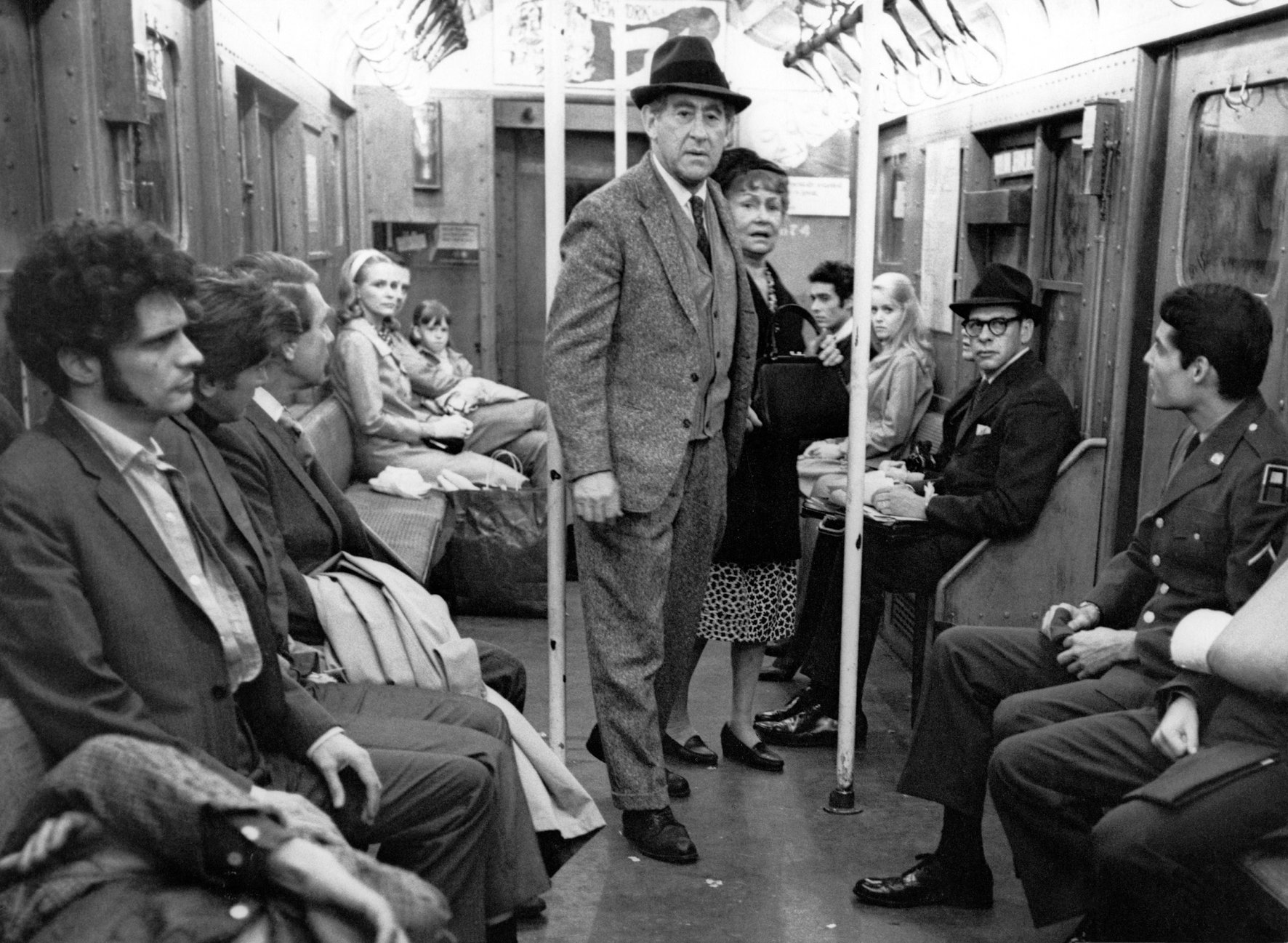 Image: Jack Gilford standing (center with hat) inside a subway car in the 1967 film, The Incident.