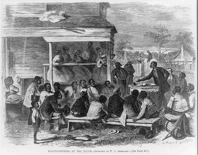 “Electioneering at the South” a wood engraving that appeared in Harper’s Weekly on July 25, 1868.
