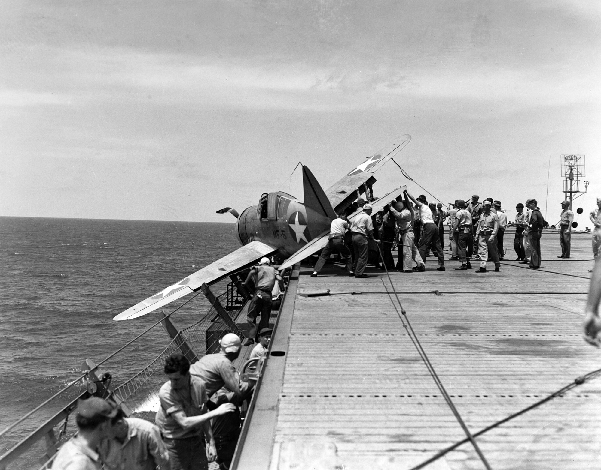 Time is of the essence as the crew of the USS Long Island works quickly to attach cables to stabilize and secure a Marine squadron Buffalo fighter plane after it made a crash landing on the flight deck and nearly goes overboard.