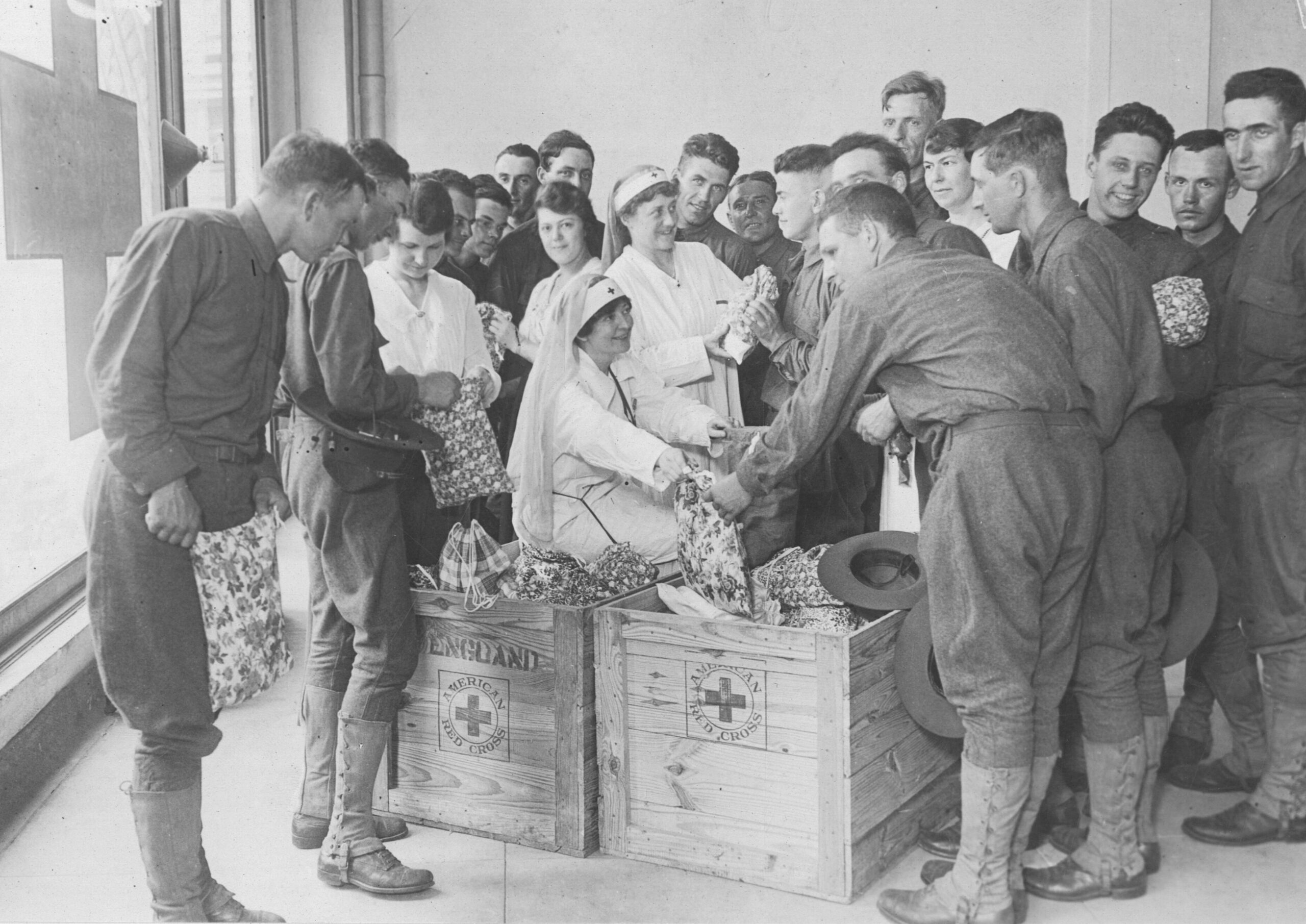 Happy “Sammies” receive comfort kits from the Red Cross. Everything was done to assure the “Sammies” that everything was being done to make them comfortable when they take up the fight for Uncle Sam.
