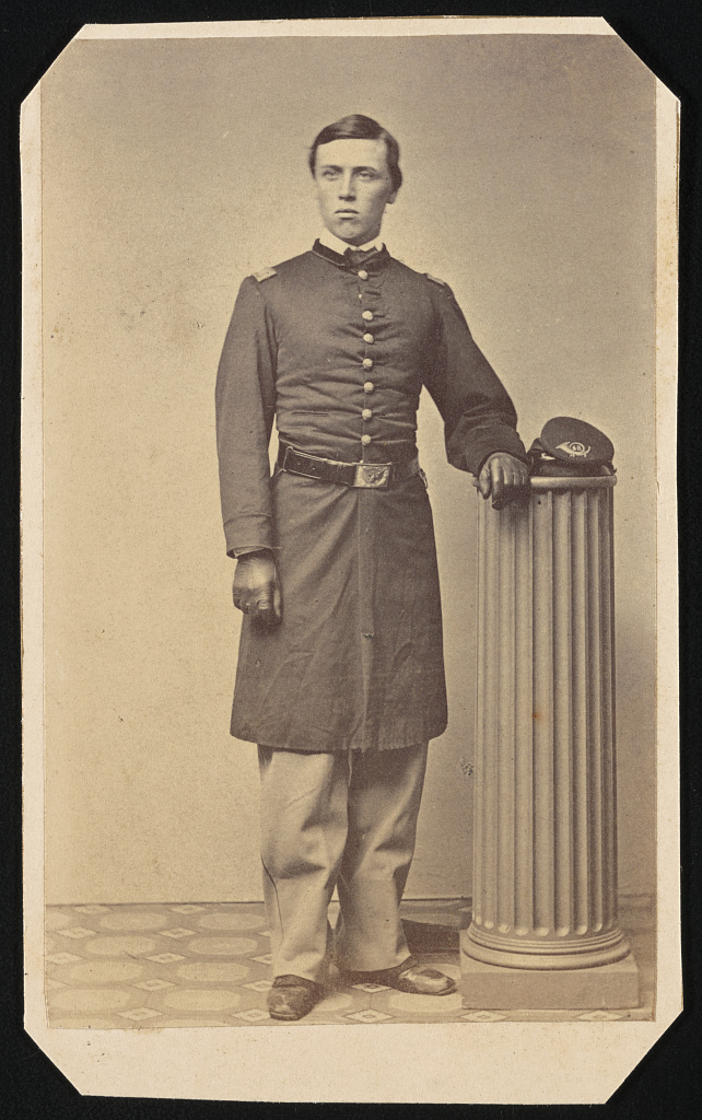Standing with determination next to a fluted column, Captain Frederick Hurst is depicted in his uniform—long frock coat, sash, and sword belt—with his kepi placed nearby. Captured in the widely popular carte de visite format, this portrait was disseminated during the Civil War as both a keepsake and a record.