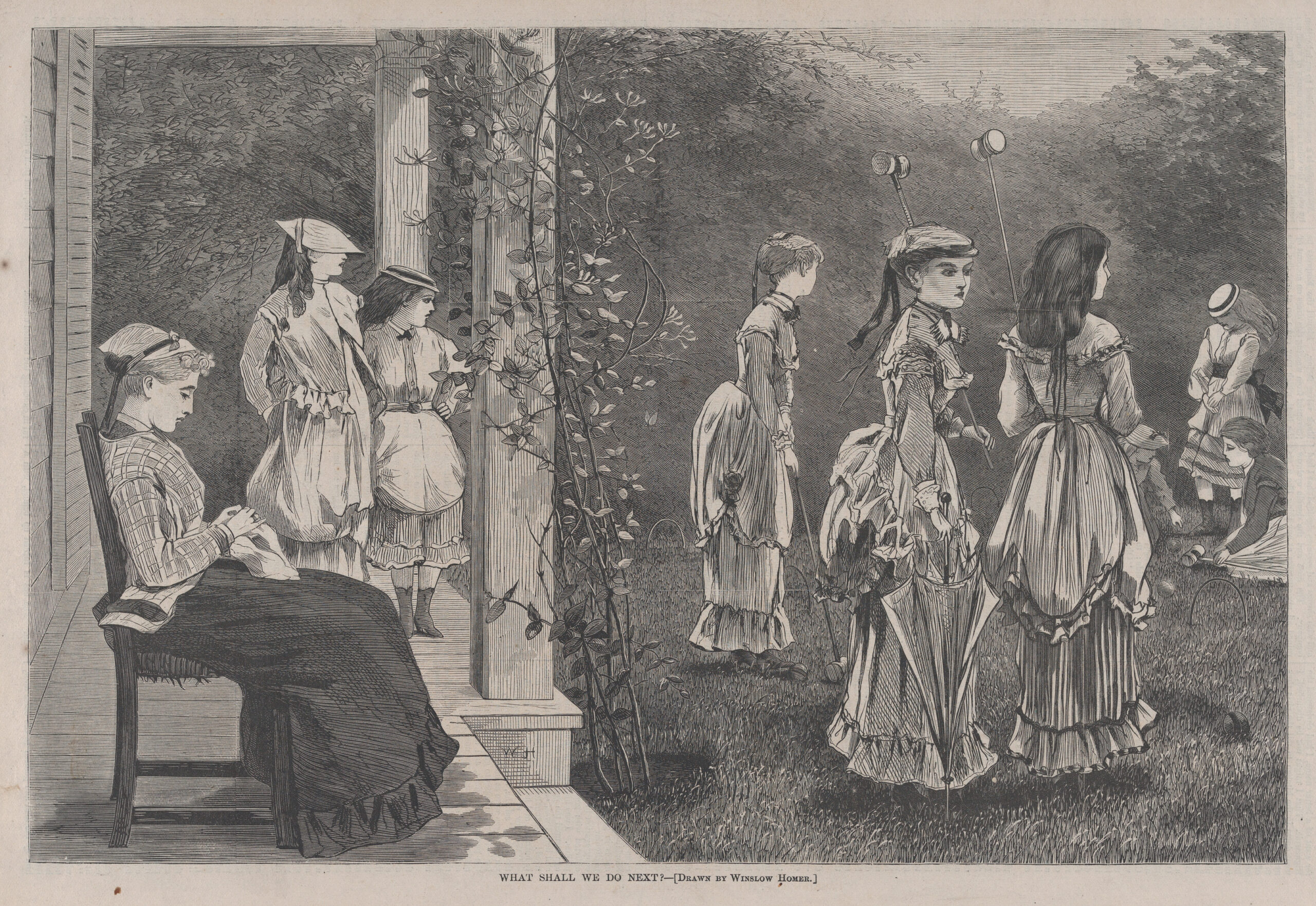 Several young women gather in a sun-dappled garden, their figures arranged like punctuation marks across a summer afternoon. Some lounge with croquet mallets and parasols; others sit upright, reserved, or contemplative. The scene is brimming with the paraphernalia of fashionable leisure—but not action. Instead, it’s marked by pause, a collective hesitation wrapped in Homer’s caption.