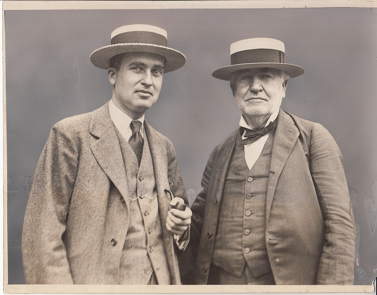 Pictured together at the close of an era of invention and innovation are Thomas Edison and his son, Charles Edison. In this moment, Charles stands beside an unshaven and contemplative Thomas, his steady gaze conveying both admiration and intent. More than a father and son, they represent the passing of a torch—one forged in laboratories and carried into the public sphere.