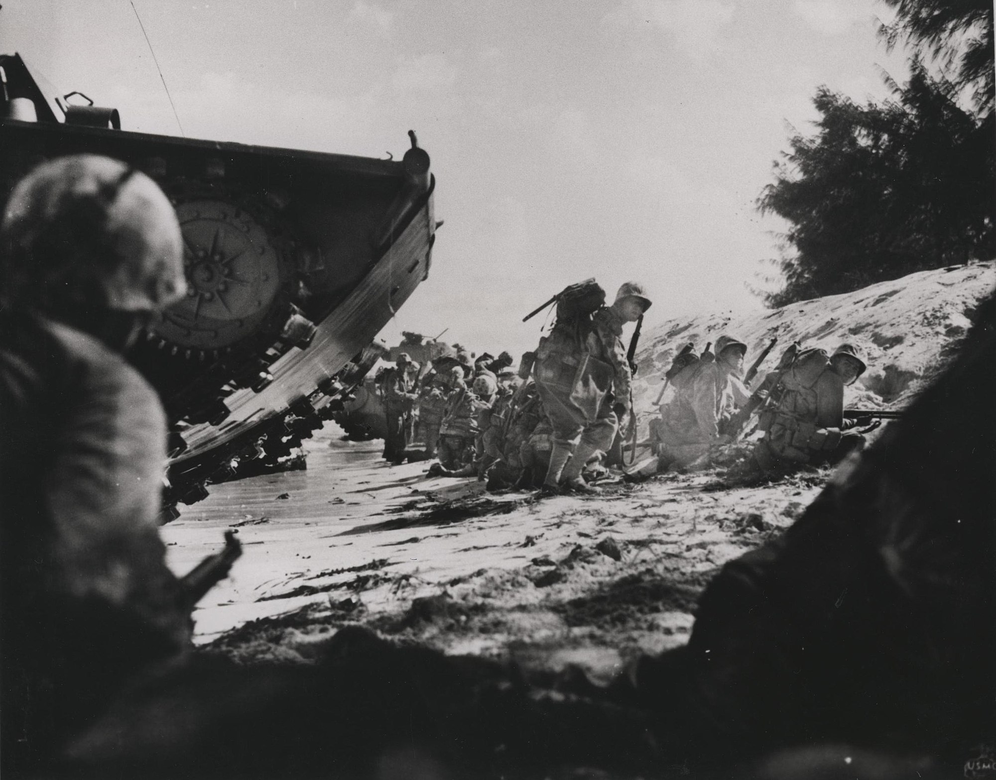 The first wave of Marines to hit the Saipan beach, take cover behind a sand dune while waiting for supporting waves to land and start the drive inland.