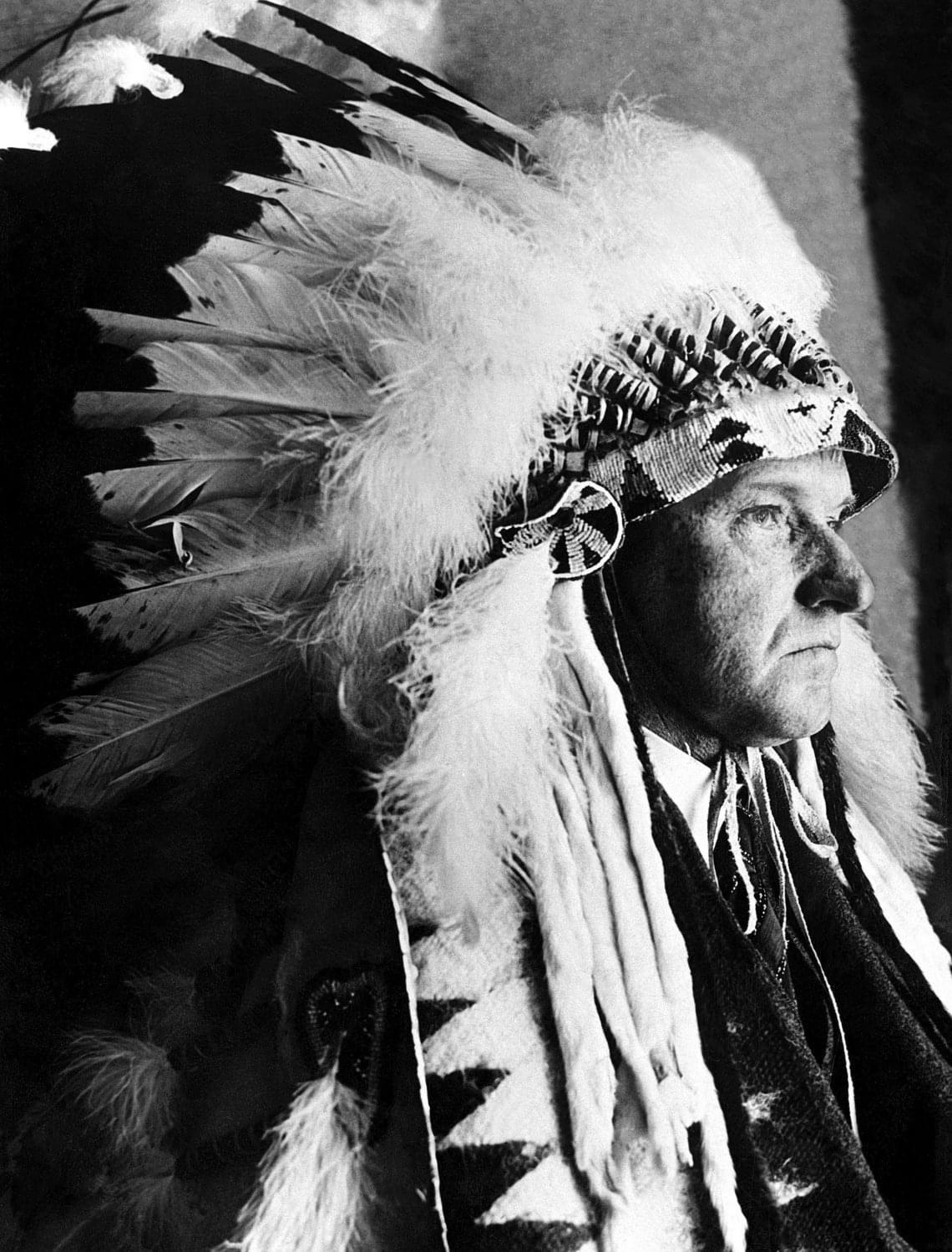 President Calvin Coolidge wearing a headdress presented to him by the Sioux Indians in 1927.