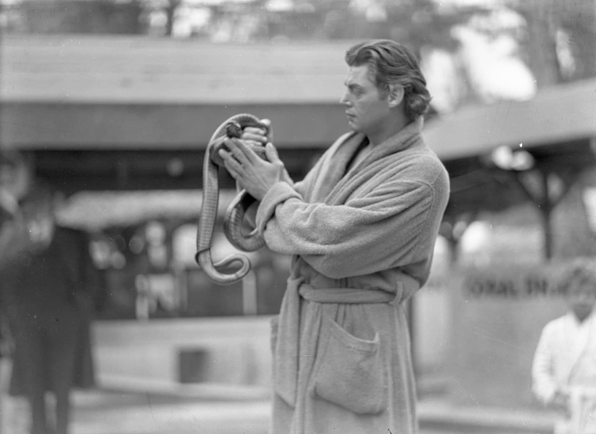 Johnny Weissmuller holding a snake during the filming of “Tarzan Finds a Son!” which was a movie released in June 1939