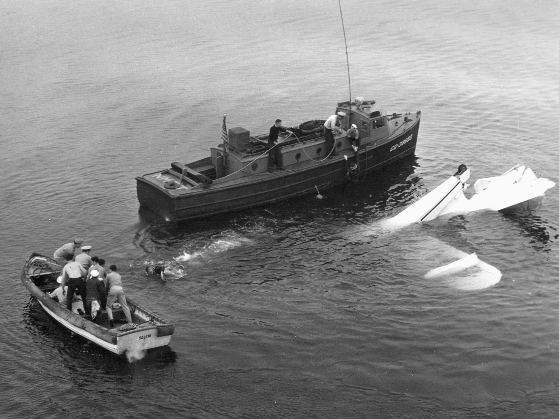 Rescue operation for the crew of a U.S. Coast Guard Grumman J2F-6 Duck, which crashed off Coast Guard Air Station Salem, Massachusetts, following a power failure on June 2, 1945. Coast Guard personnel work swiftly to recover the downed crew, showcasing their dedication to maritime safety during World War II.