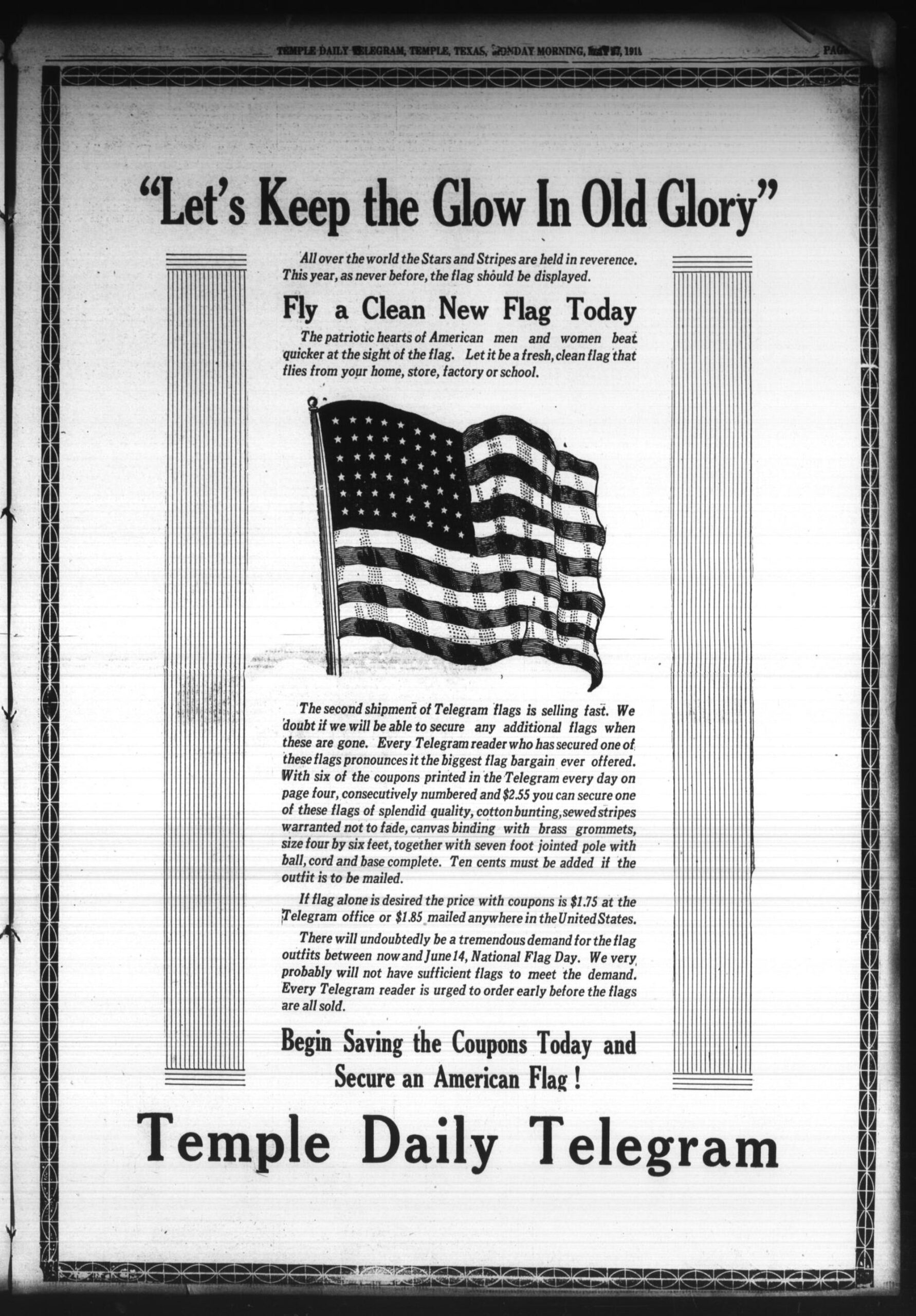 Advertisement published in a newspaper in Temple, Texas on June 2, 1918.