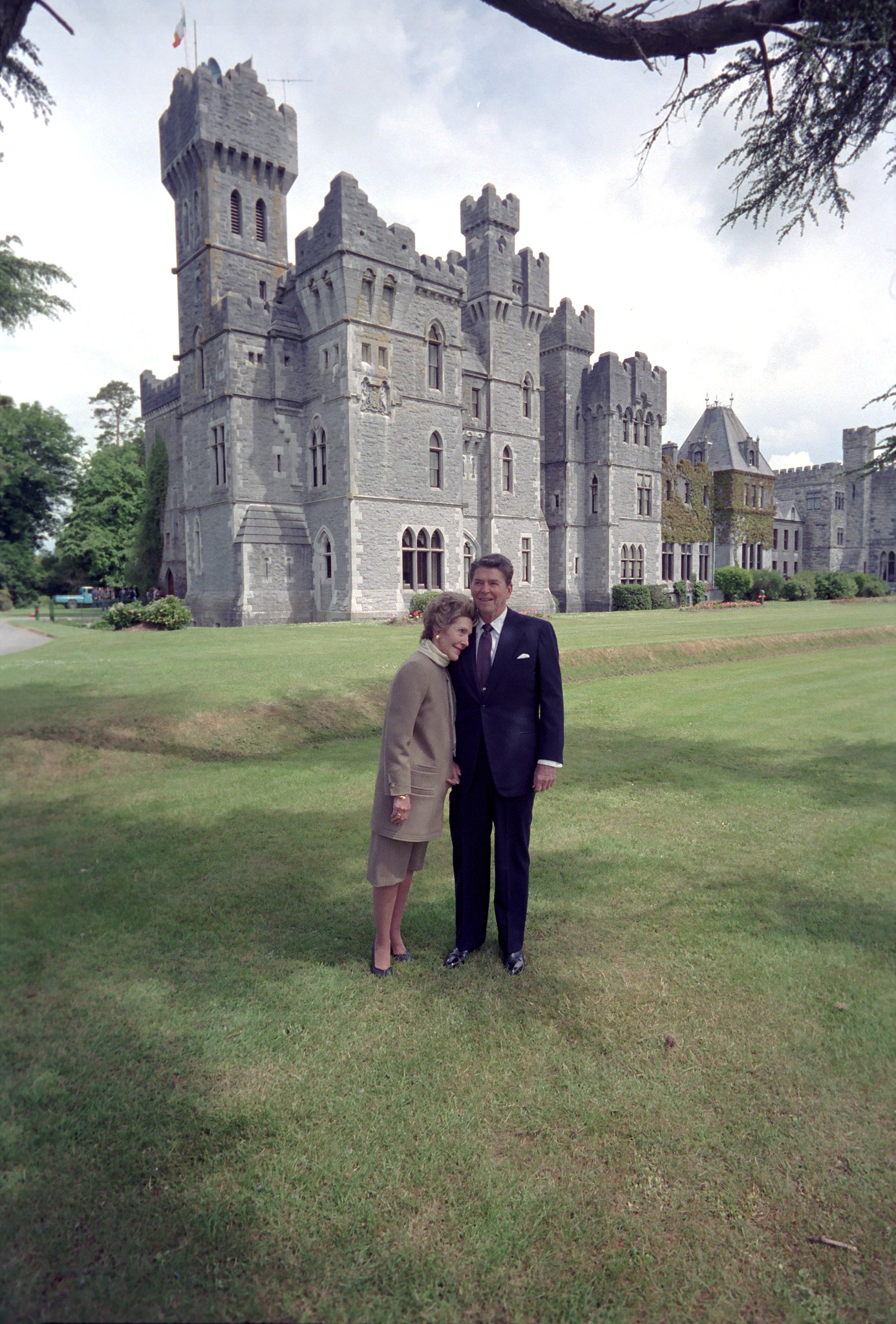 President Ronald Reagan and Nancy Reagan standing in front of Ashford Castle in Ireland.