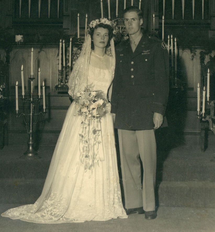 A pilot of a B-17 and his bride on their wedding day in California on June 2, 1945.