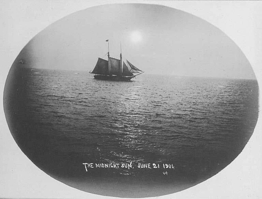 Sailing ship at sea during the midnight sun, Alaska, June 21, 1906