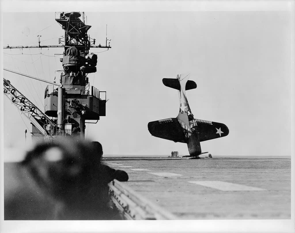 Douglas SBD “Dauntless” dive bomber balanced on nose after crash landing on carrier flight deck, June 21, 1943