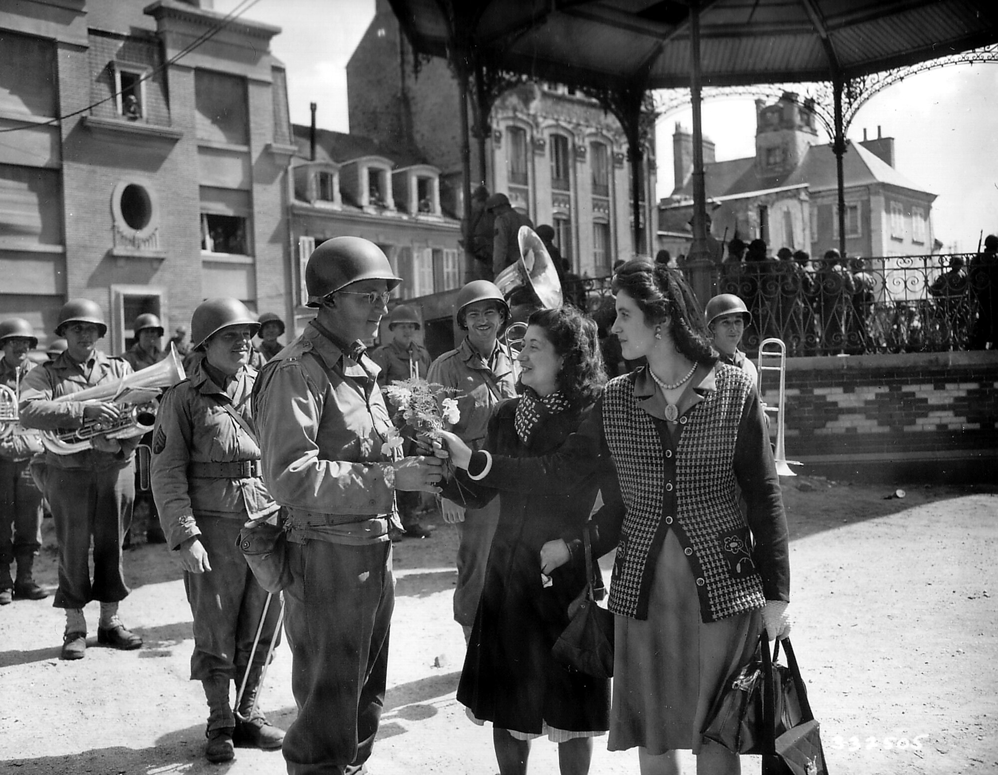 Two French women give flowers to an American soldier during a ceremony that was held after the liberation of Cherbourg, France on June 27, 1944