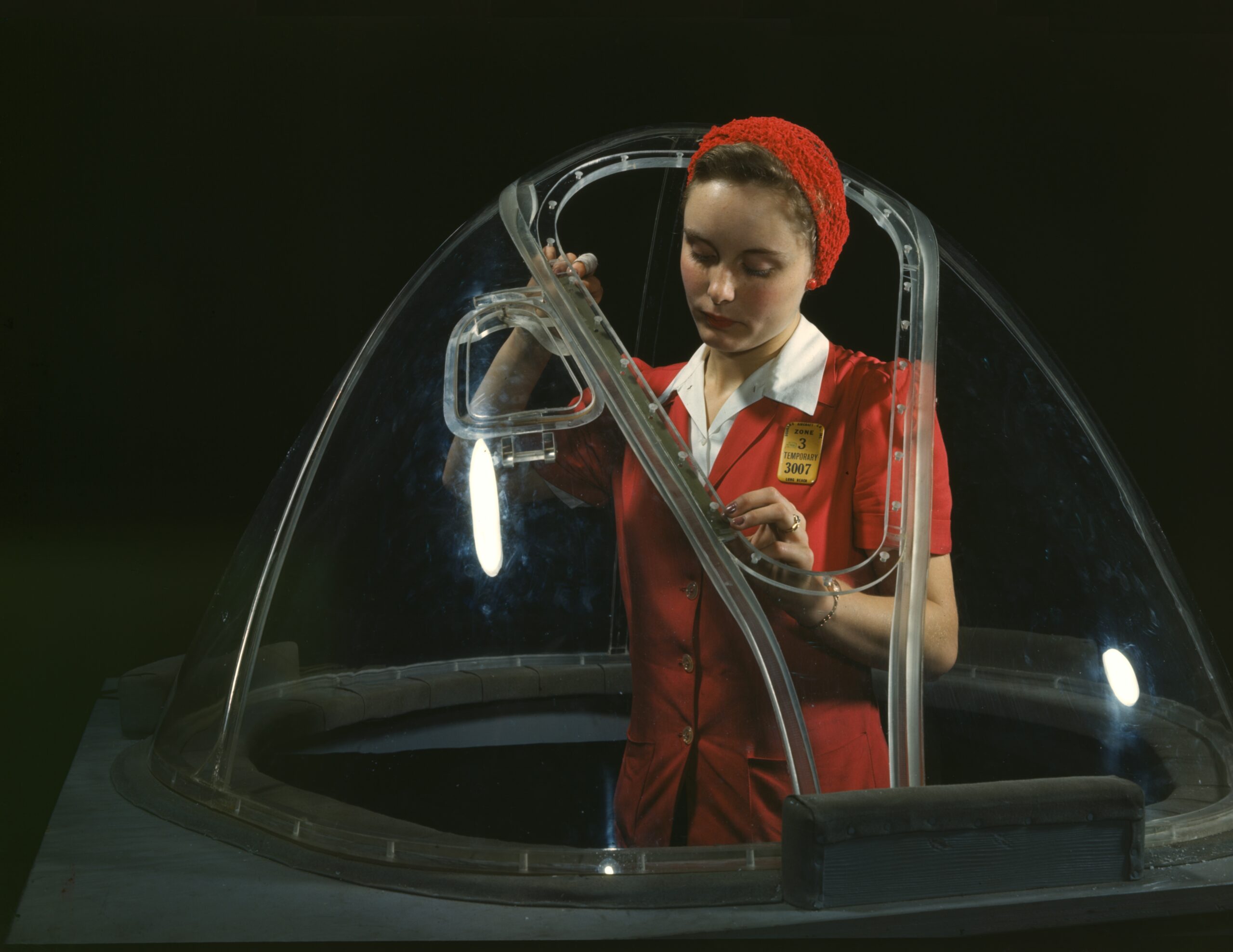 This young American lady is putting finishing touches on the bombardier nose section of a B-17F bomber in Long Beach, California.