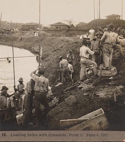 Loading holes with dynamite during construction of the Panama Canal