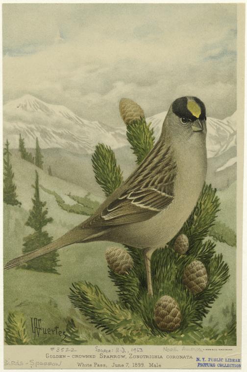 Golden-crowned sparrow, Zonotrichia coronata in White Pass (on the border of Alaska and British Columbia) that’s dated June 7, 1899 which was during the Harriman Alaska Expedition.