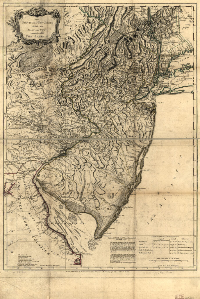 Published in the 1770s, this map captures the province at a pivotal moment. It reflects the resolution of the decades‑long “Line War,” the bitter struggle between East and West Jersey proprietors over where the colony’s internal boundary truly lay. The Lawrence Line of 1743 — preserved here — was the final survey that ended a century of overlapping land claims, rival maps, and periodic armed confrontations. By the time this map was engraved, those foundational borders were fixed, and the industrial era was beginning to reshape the very landscape it records.