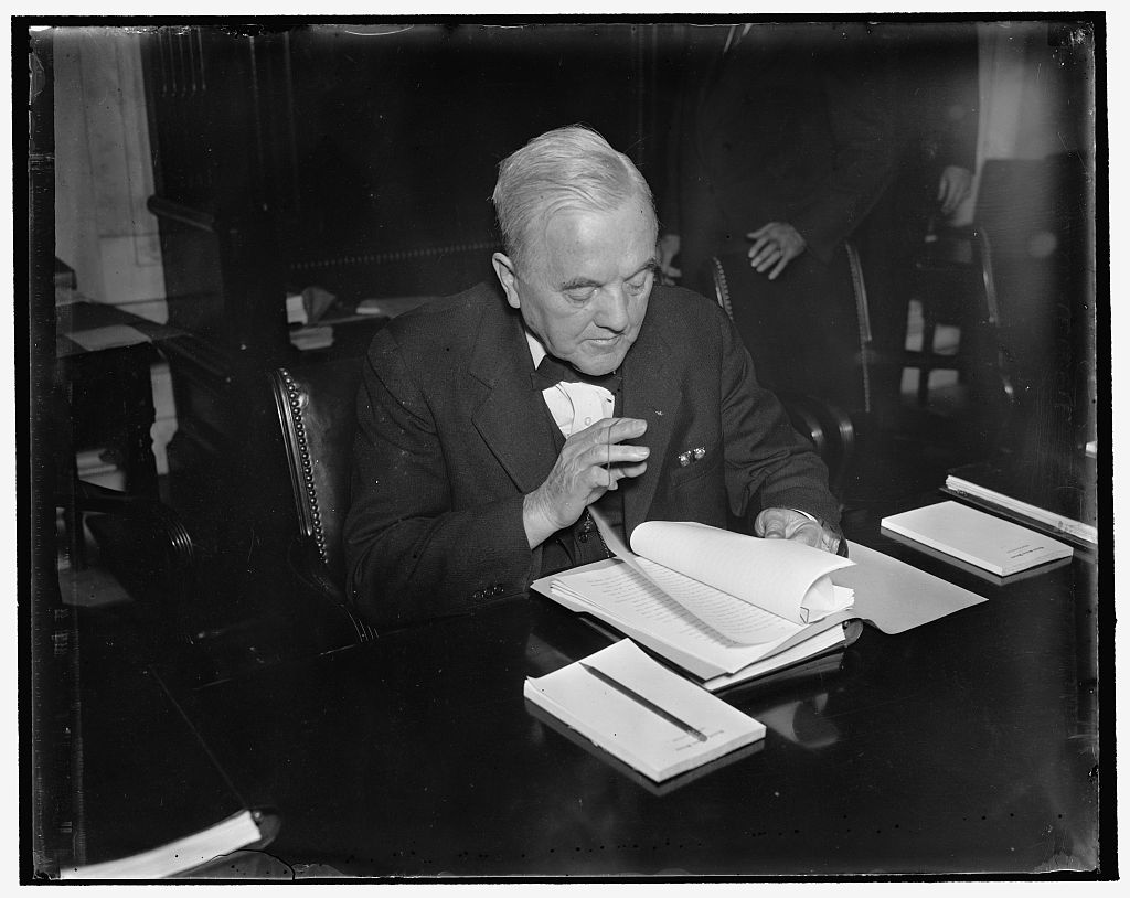 “Rubber band snapper Norris. Washington, D.C., March 12. The whang, whang, of a heavy rubber band in the hands of Senator George Norris, of Nebraska today interrupted the proceedings at the Senate Judiciary Supreme Court hearing, the noise reverberated in the marble caucus room. Finally Chairman Ashurst stood up and said: “However, I should like to ask the audience to quit shuffling around, to cease fiffling papers and stop snapping rubber bands.” Norris flushed, scowled and put his hands in his pockets, Norris is shown with his rubber band during the lull…”