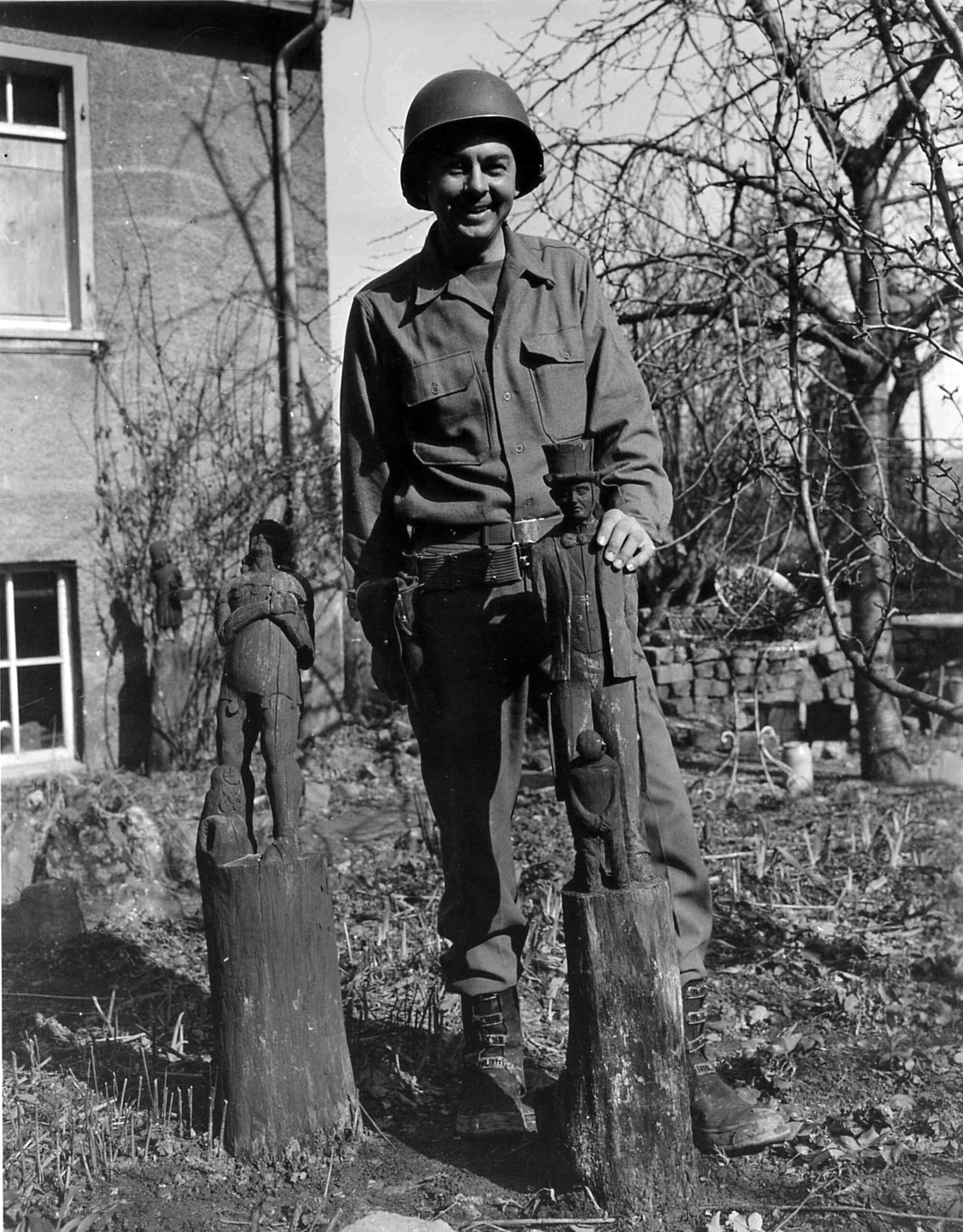 “Sgt. Walter S. of Memphis, Tenn., stands between hand-carved figures made by local German artisan in Mayen, Germany. At right is tall figure of Abraham Lincoln with small [illegible] at his feet, both carved out of a former fence-post. Sergeant S. is with U.S. Army Signal Corps.”