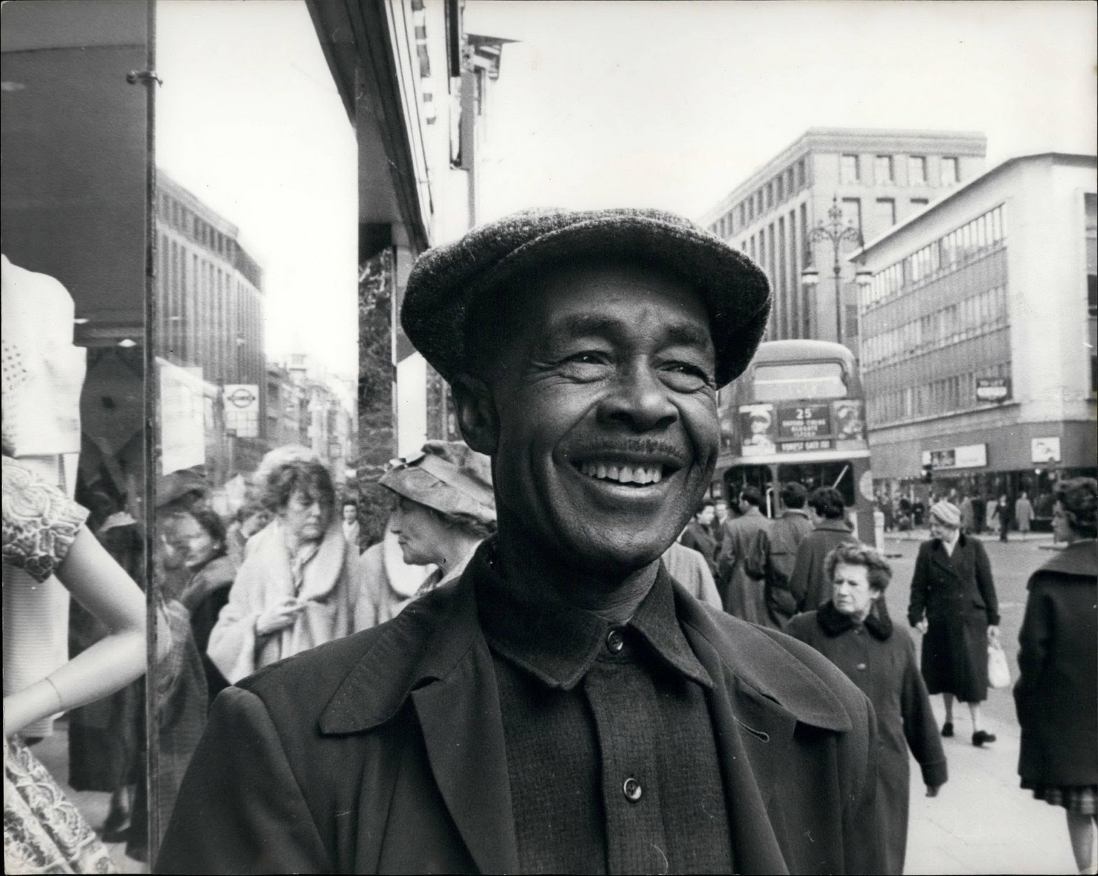 Jesse Fuller arriving at London Jazz Club about a week before his 64th birthday in March 1960.
