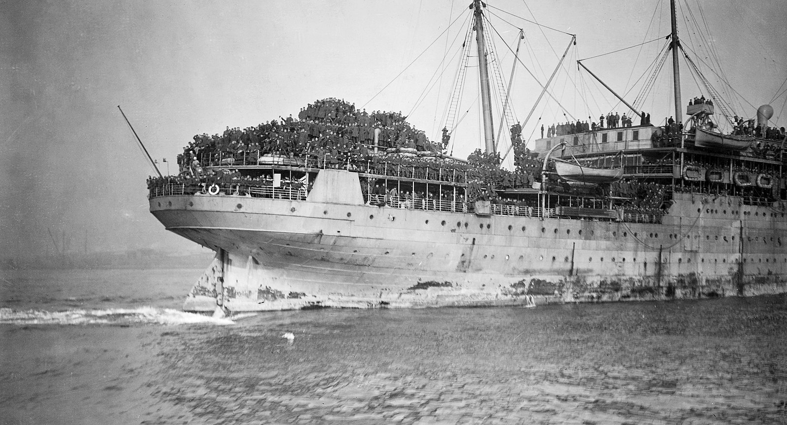 Returning U.S. troops aboard the America as she nears the Hoboken Port of Embarkation.
