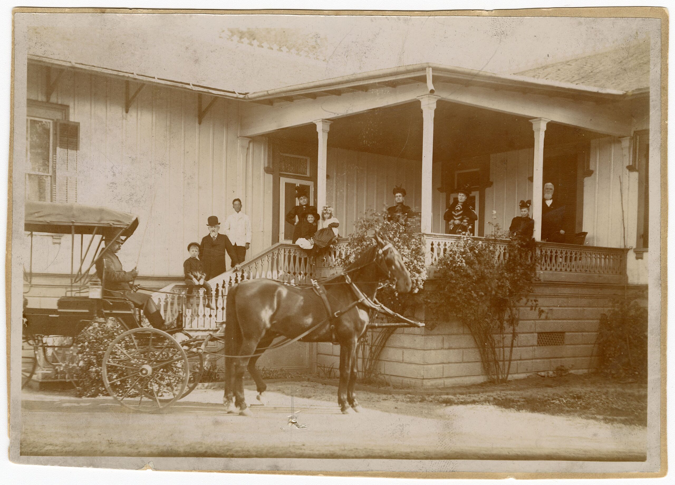 Former President Benjamin Harrison standing on the steps of Escondite Cottage at Stanford University in 1894.