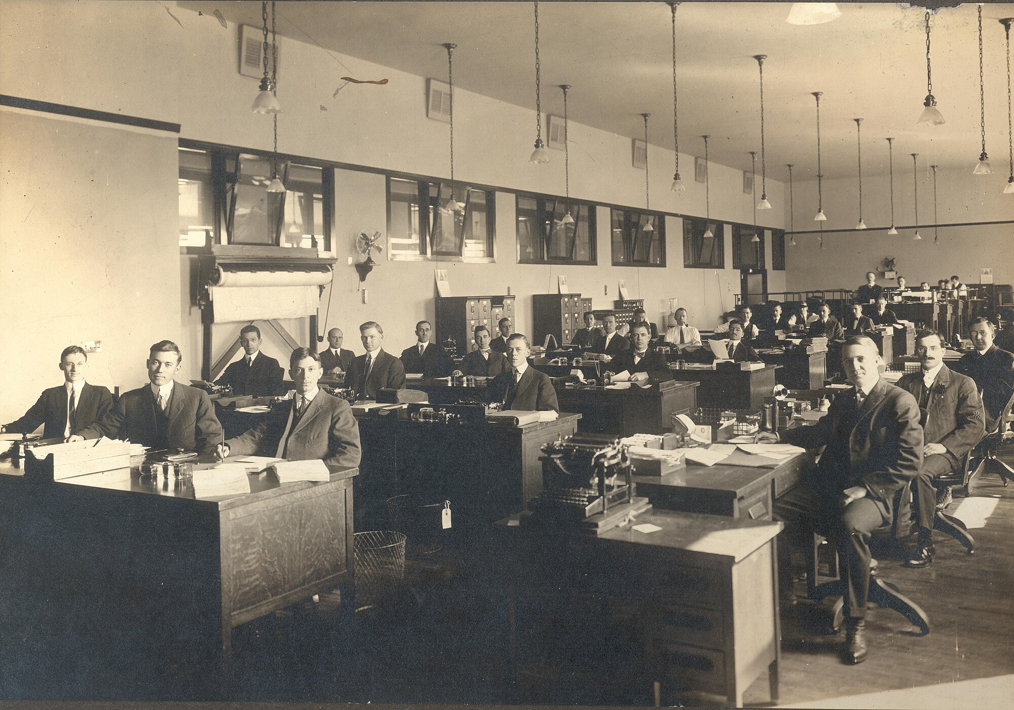 Image of employees at a U.S. Postal Savings office in New York City in 1914 via Wikimedia Commons, public domain