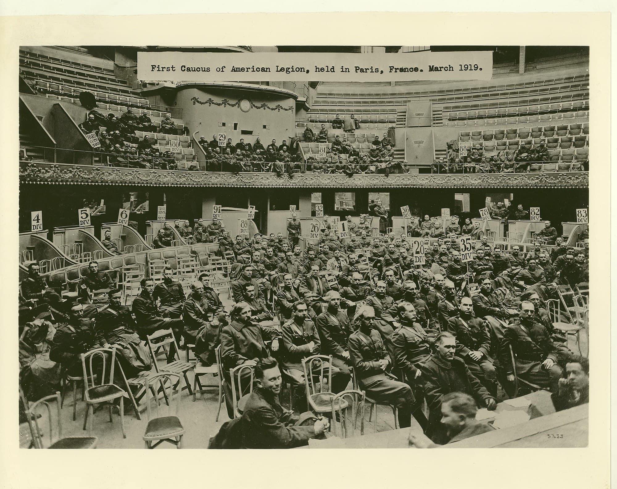 Image of the First Caucus of the American Legion in Paris in March 1919 via Wikimedia Commons, public domain