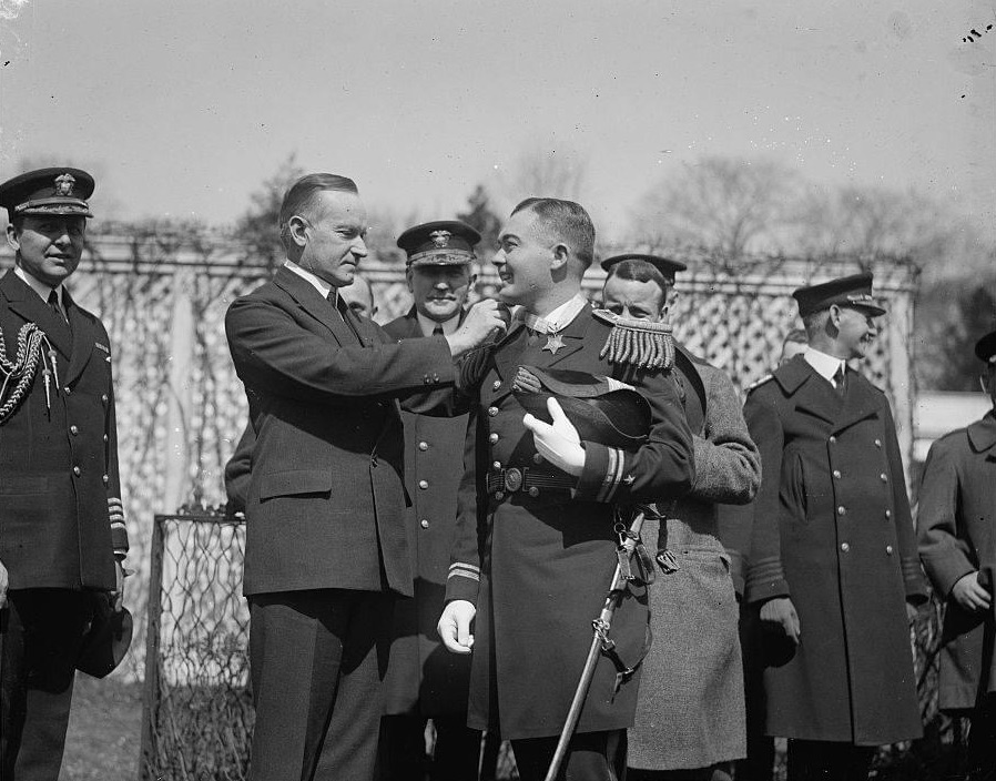 President Calvin Coolidge presenting the Medal of Honor to Lt. Thomas J. Ryan of the U.S. Navy for rescuing a woman from a burning hotel during an earthquake in Japan.