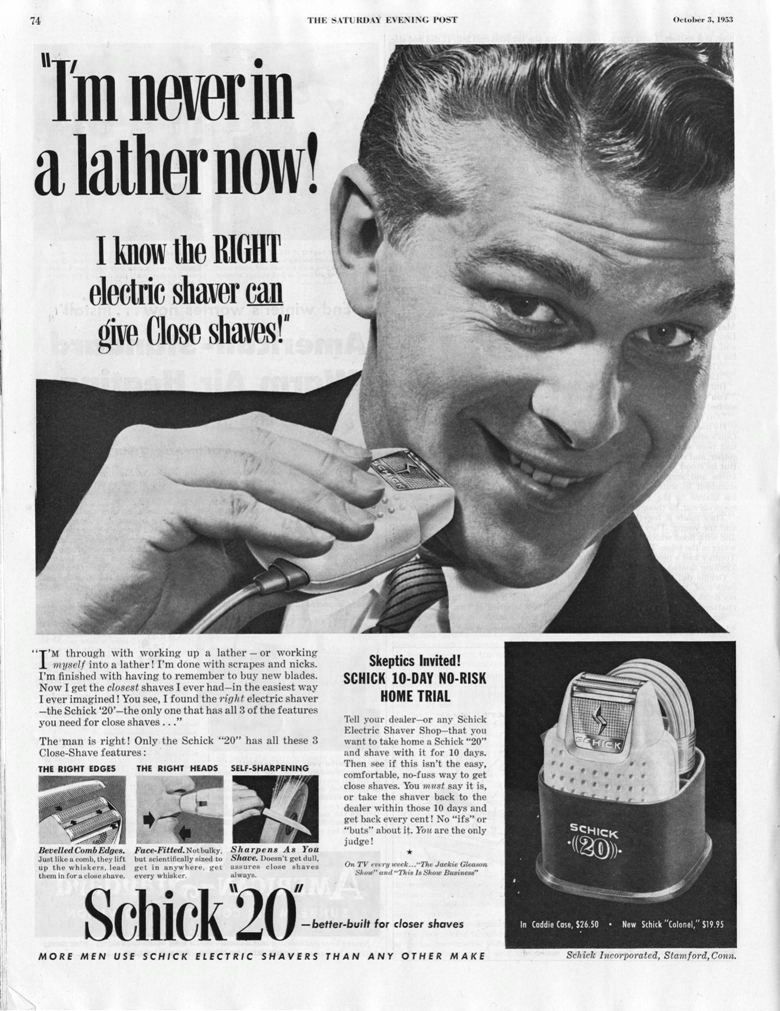 Across the next two decades, Schick refined that breakthrough through quieter motors, stronger cutters, and more contoured shaving heads, even as wartime production reshaped the market. By the early 1950s, those steady improvements culminated in models like the Schick “20,” the one shown here—sleek, confident, and engineered for comfort with beveled comb edges, face‑fitted heads, and self‑sharpening blades. It represented the full flowering of the idea Schick first put into American hands on March 18, 1931.