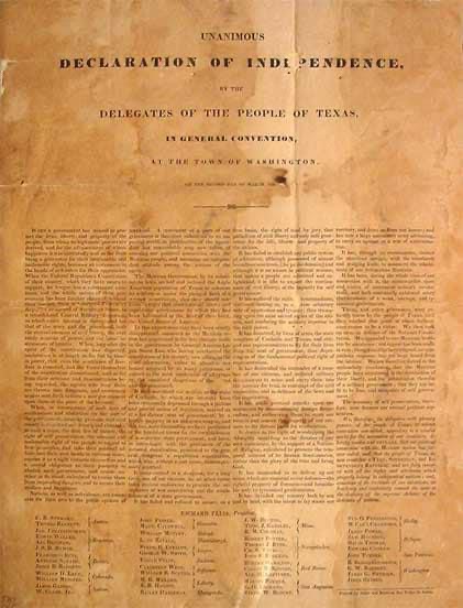 On March 2, 1836, the Republic of Texas was created when delegates signed the Texas Declaration of Independence (from Mexico).