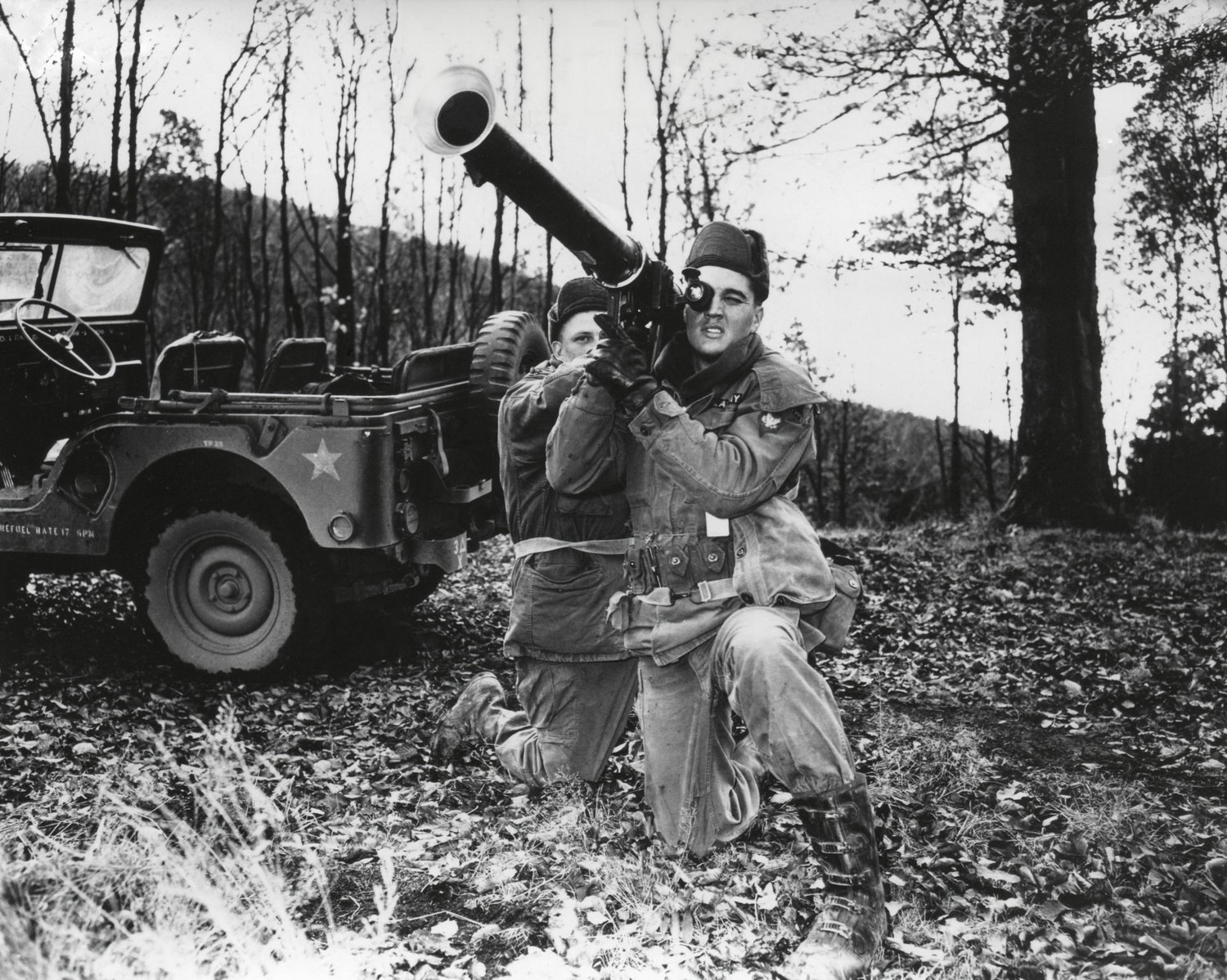 Elvis Presley training with a bazooka while on maneuvers in Germany. He served in Germany from October 1, 1958, until March 2, 1960, with 1st Medium Tank Battalion, 32d Armor, 3d Armored Division
