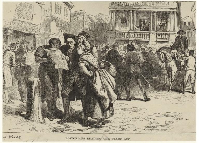 Image: Bostonians reading the Stamp Act via Wikimedia Commons, public domain