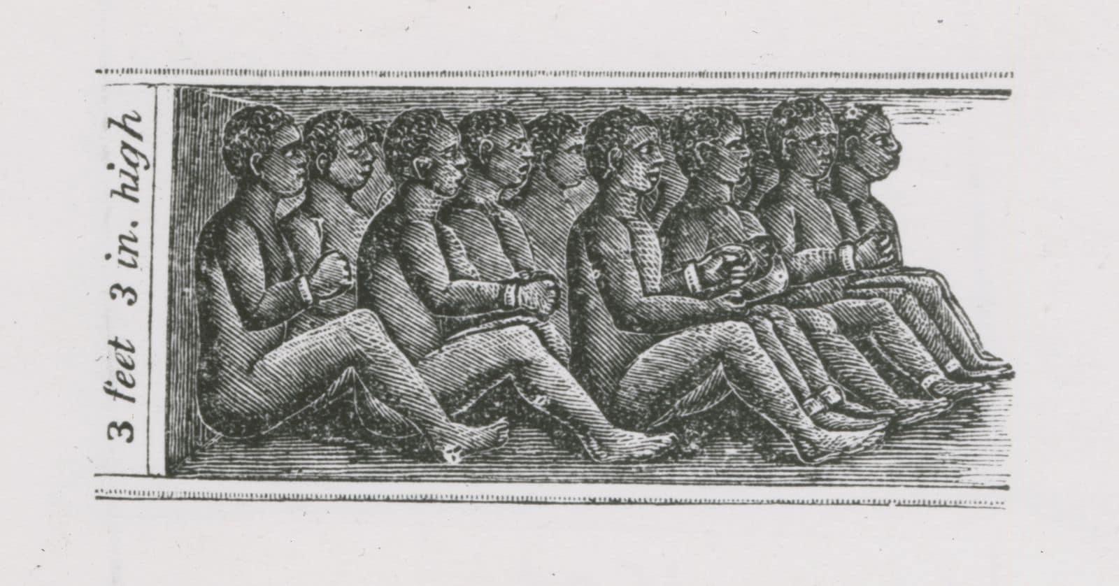 Image: View of chained African slaves in cargo hold of slave ship, measuring three feet and three inches high via NYPL Digital Collections, no known restrictions